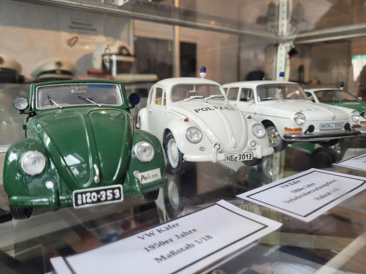 Einige Einsatzfahrzeuge (von links): VW Käfer der Einsatzkräfte (1950-er Jahre), VW Käfer der Verkehrsüberwachung (1960-er Jahre) und VW Variant (1960-er und 1970-er Jahre)